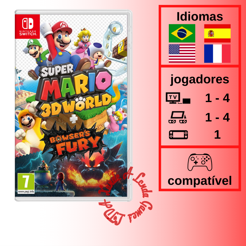 O jogo Super Mario 3D World + Bowser’s Fury conta com a mesma jogabilidade cooperativa, fases criativas e power ups do jogo original, mas com melhorias adicionais. Na parte Super Mario 3D World do jogo, os personagens se movem mais rapidamente e a sua habilidade de correr também aumenta mais rapidamente. Ambas aventuras são compatíveis com o modo Snapshot recém-adicionado - pause a ação para capturar uma imagem, aplique filtros e decore com carimbos!